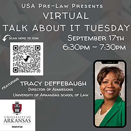 Guest Speaker for this session will be Tracy Deffebaugh, Director of Admissions, University of Arkansas School of Law, who will join us virtually!