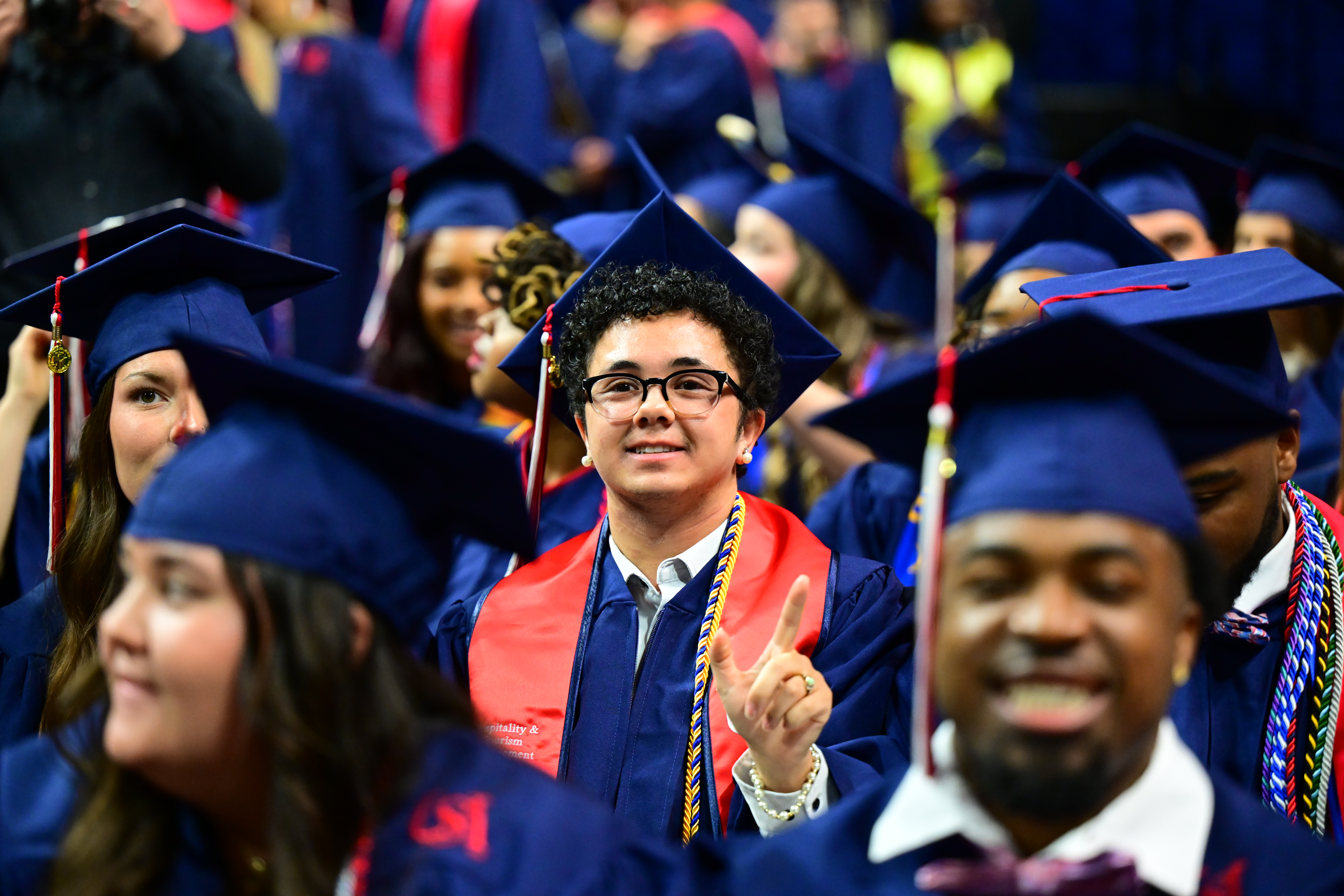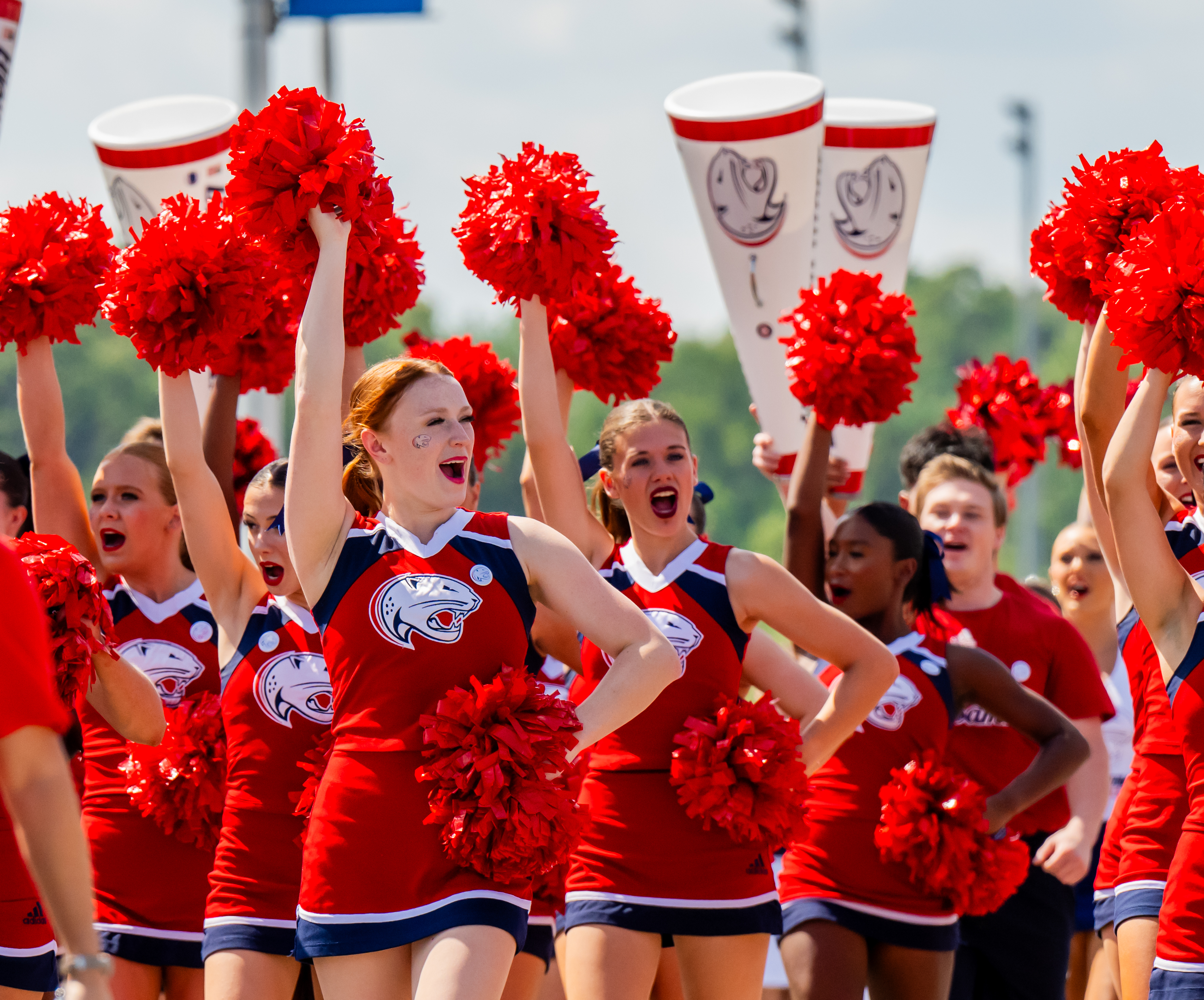 Cheerleaders holding up pom poms. Class of 2029 photo. Studnets at commencement. Crowd outside of commencement.