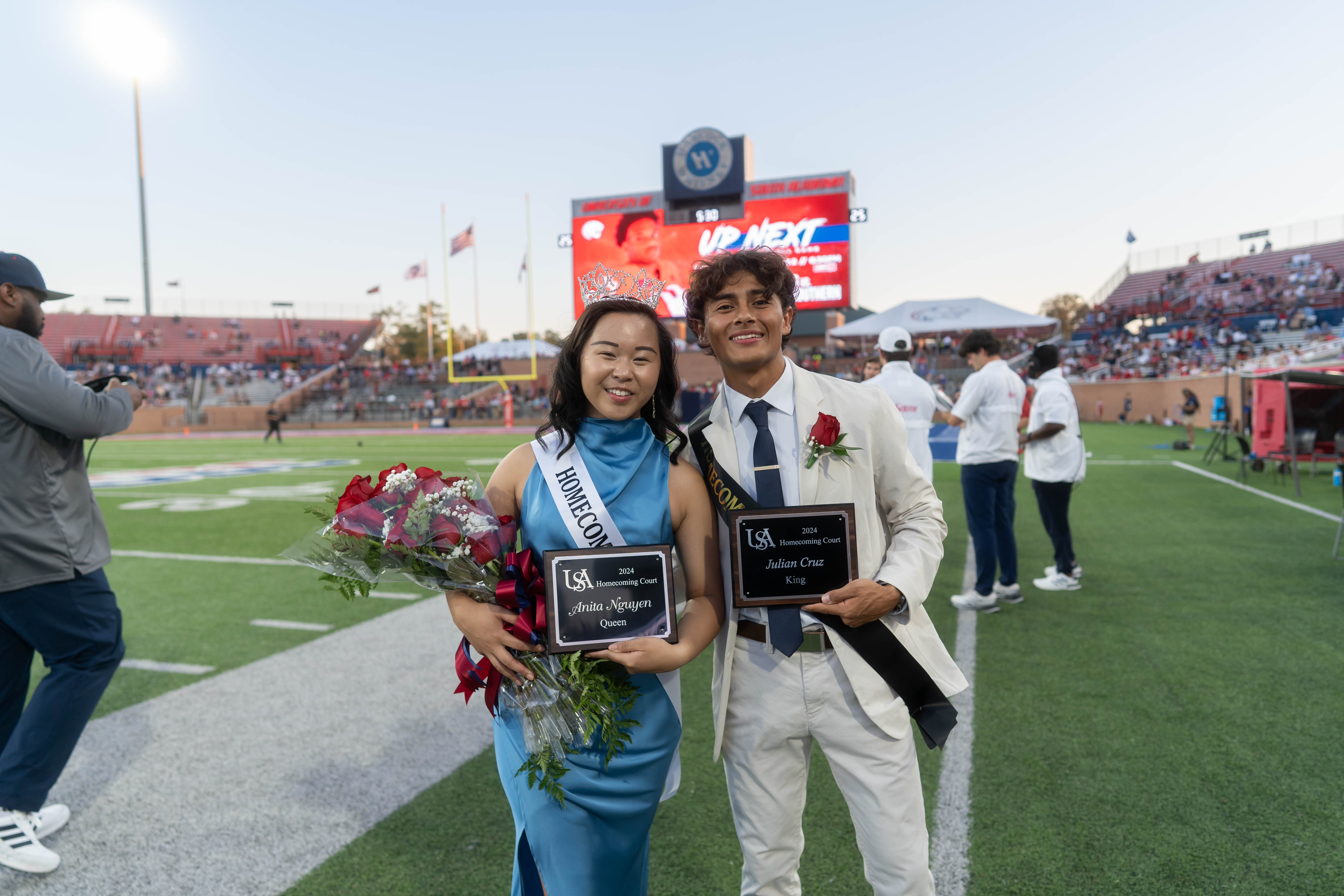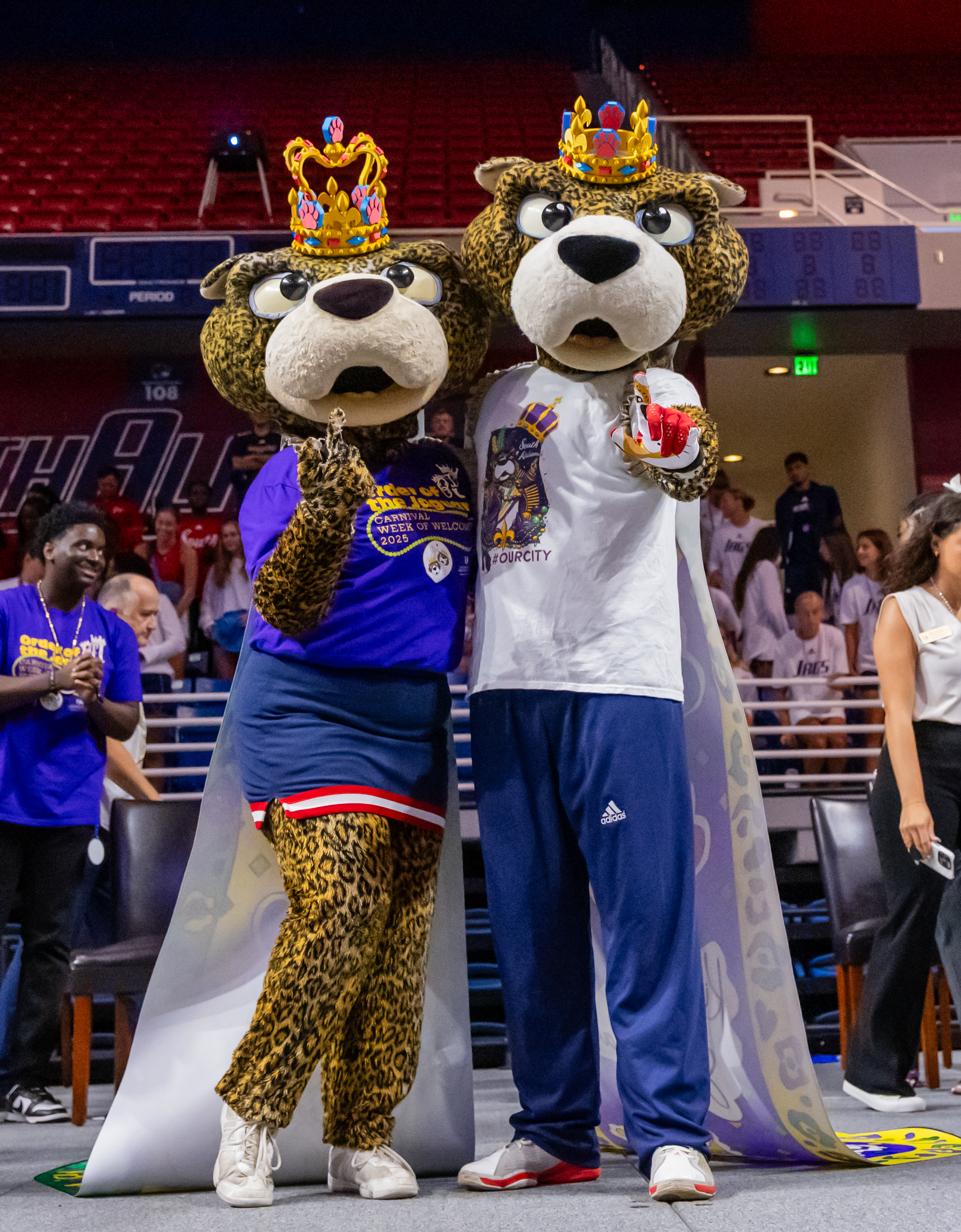 Two students holding up J's at convocation. Stage at convocation. Homecoming king and queen. Jag Head Formation
