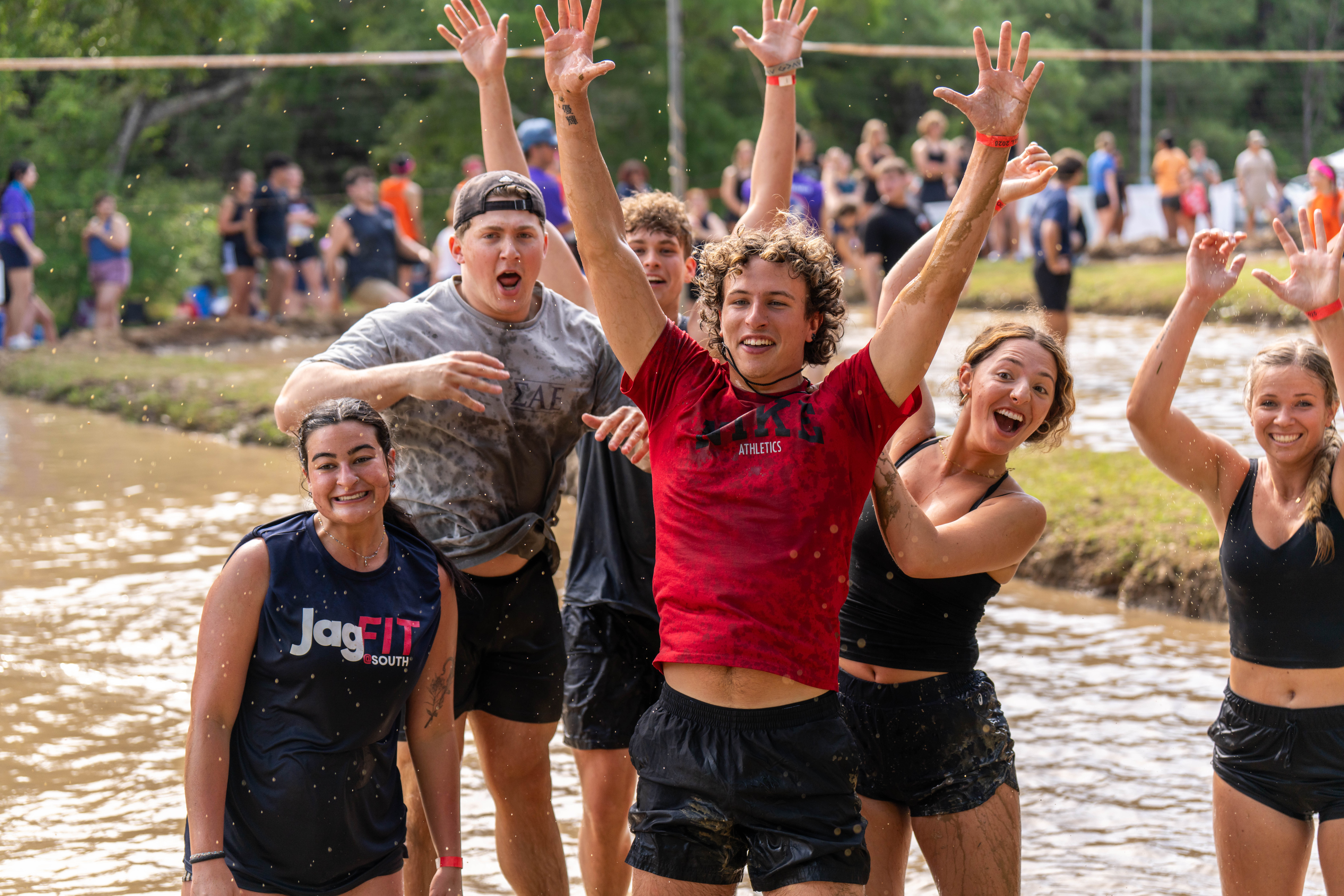 Humanities building Students walking on jag fitness trail. Students with J's Up. Students walking in library breezeway.