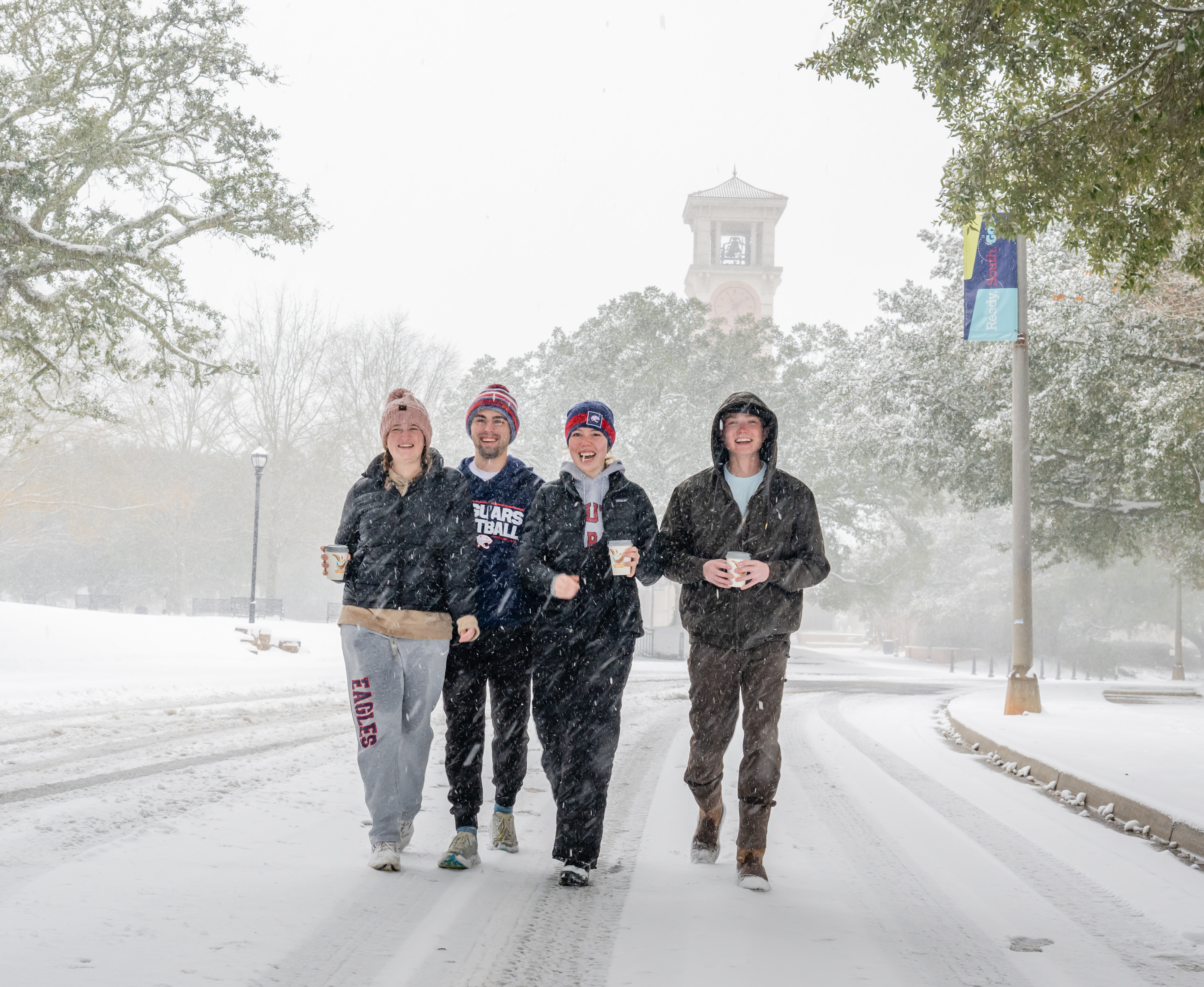 Students at snow day on campus. Tree Lighting