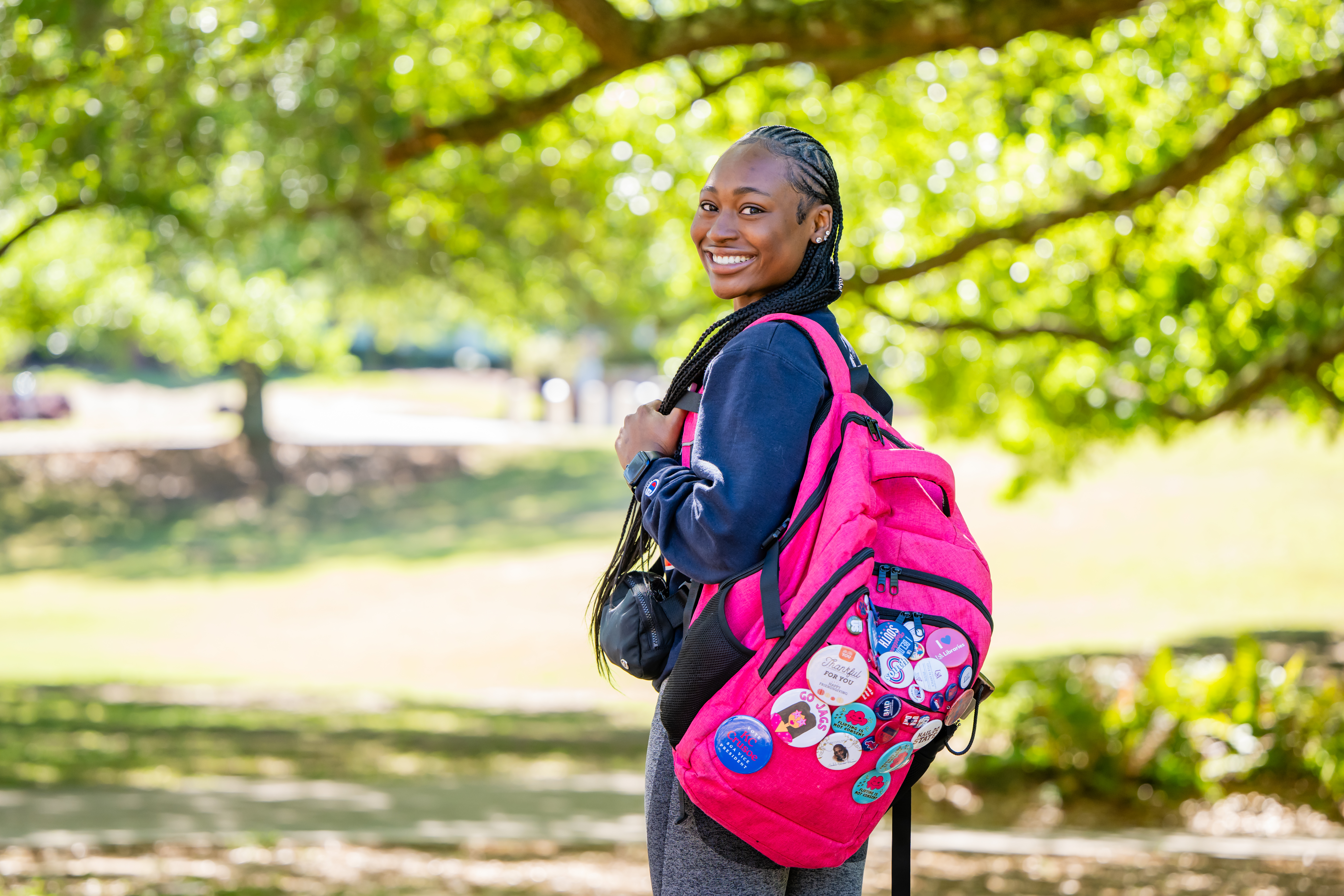 Alumni Plaza with students walking. Student with backpack on with buttons on it. Two biomed students walking on campus. Creek on campus.