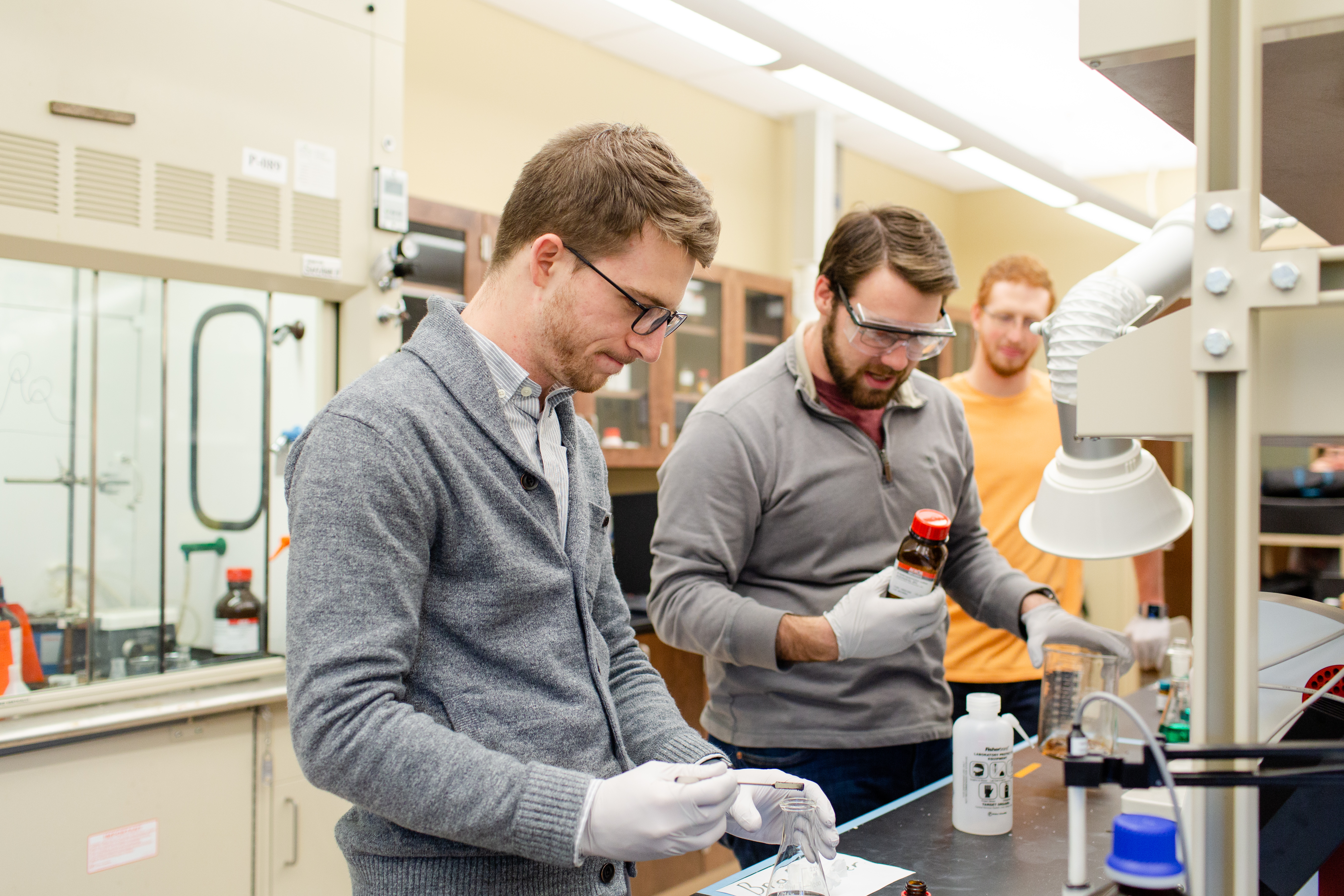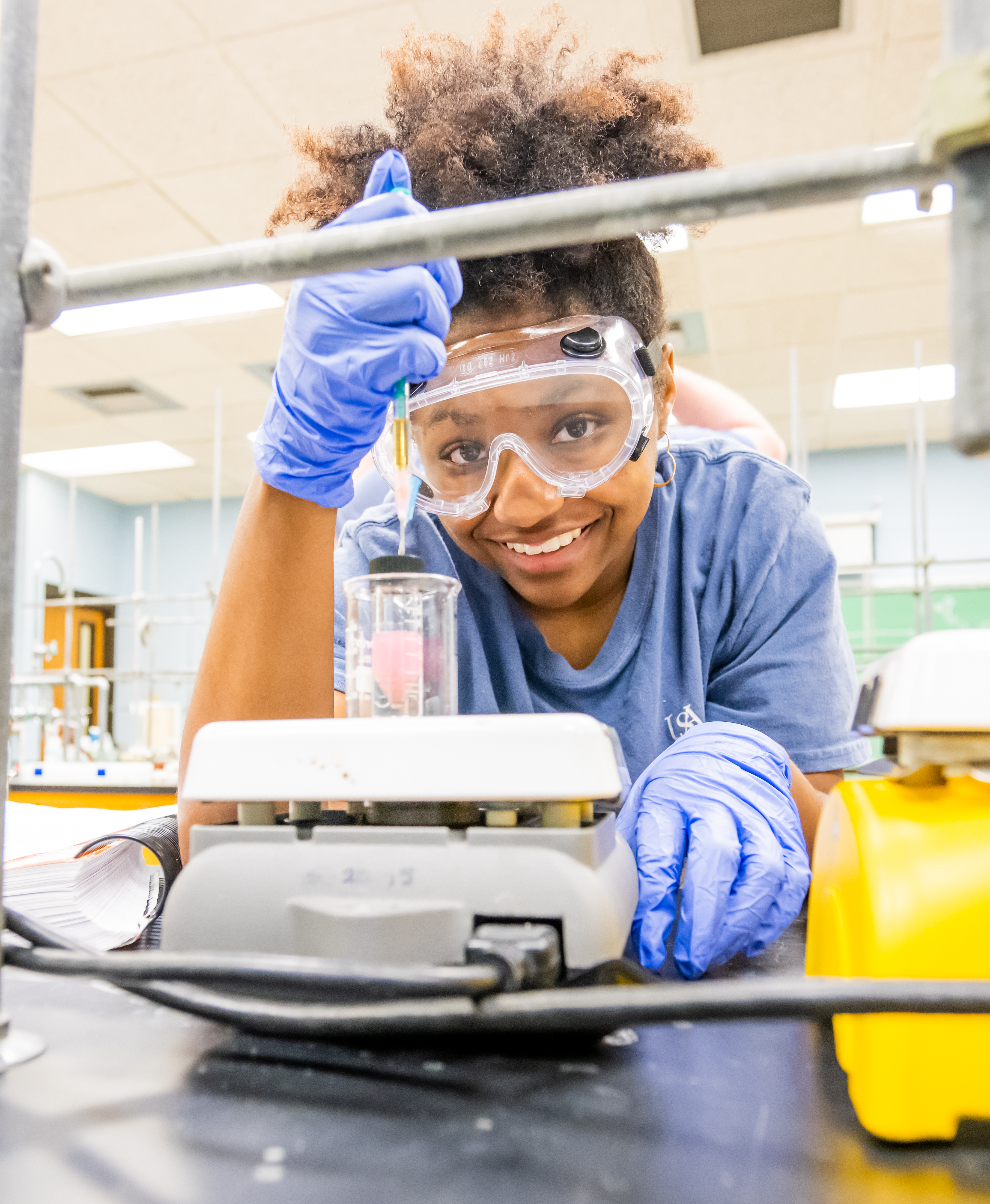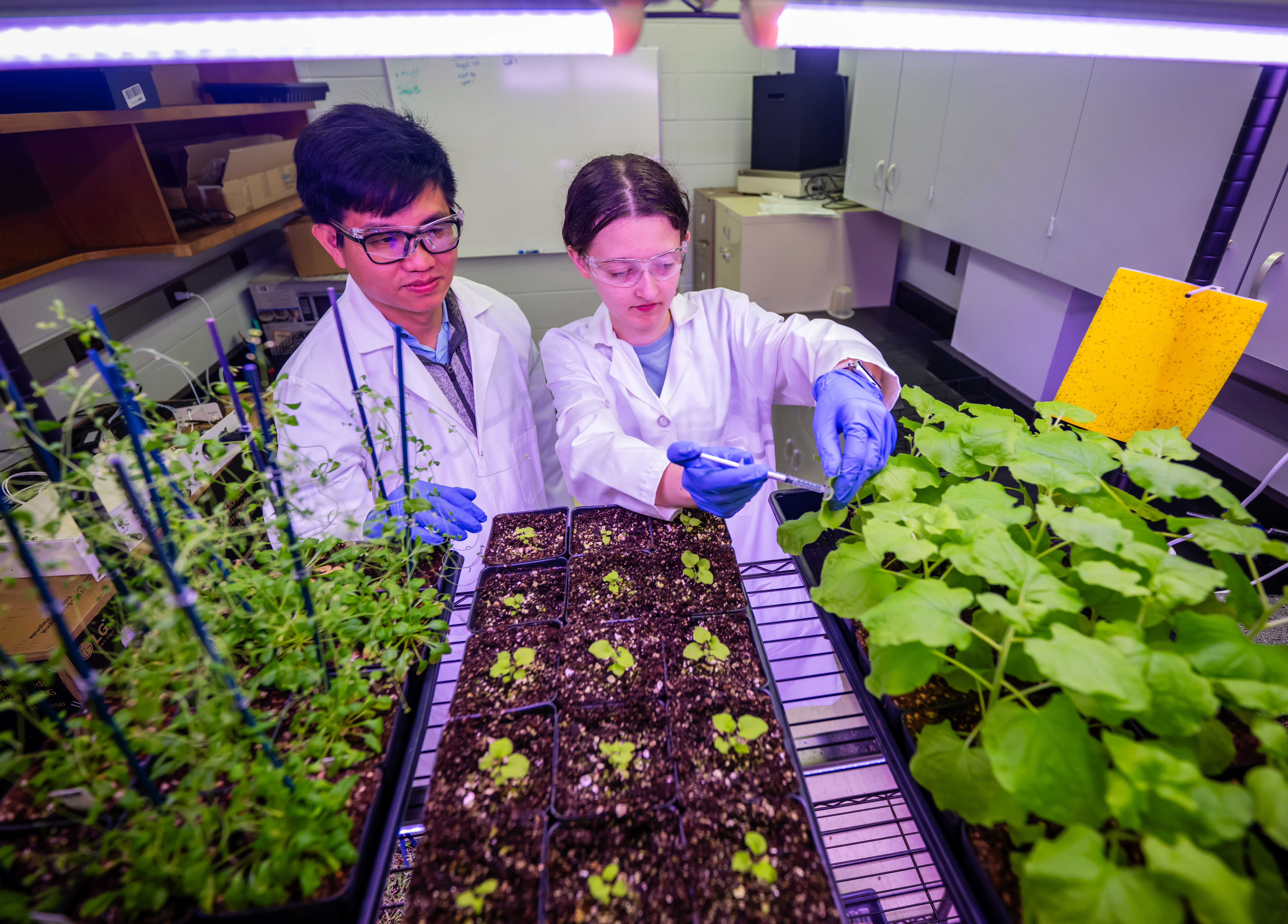 Student working with a faculty member planting in biology. Student injecting plant in biology. Two students working in lab in biomedical engineering. Student working in chemistry lab with beaker.