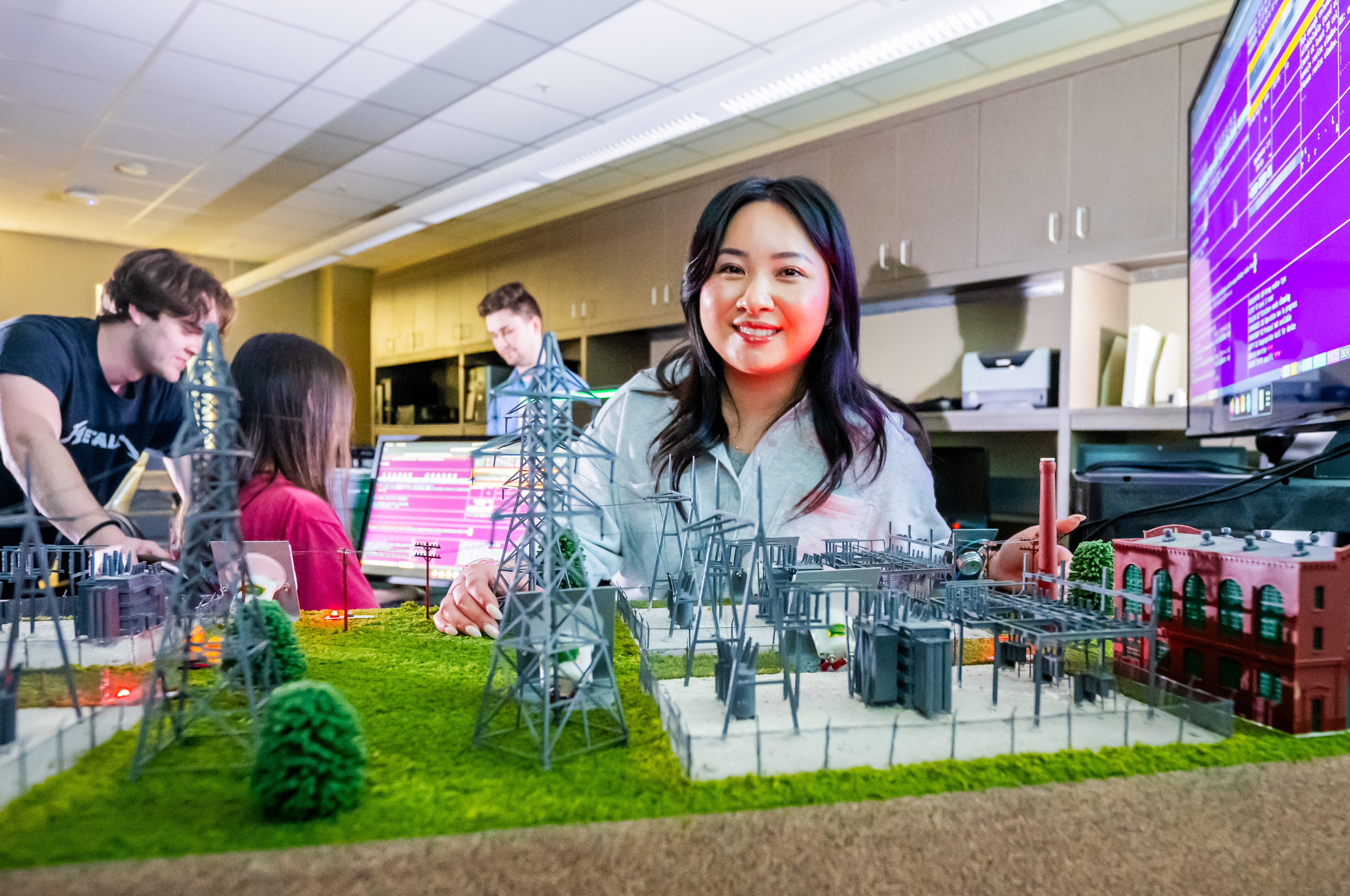 Students working at desk in classroom. Students listening in classroom. Student in front of whiteboard in Computer Science. Student working with model in lab.