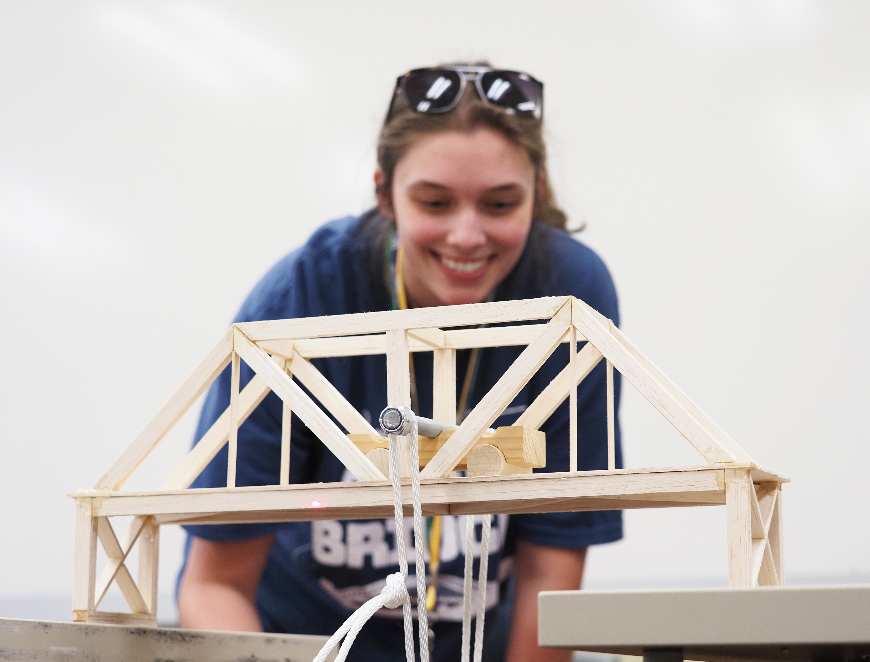 Student working in lab with virtual reality headset. Students dissecting sharks in a lab. Students looking at electronic map. Student working on bridge model in engineering.