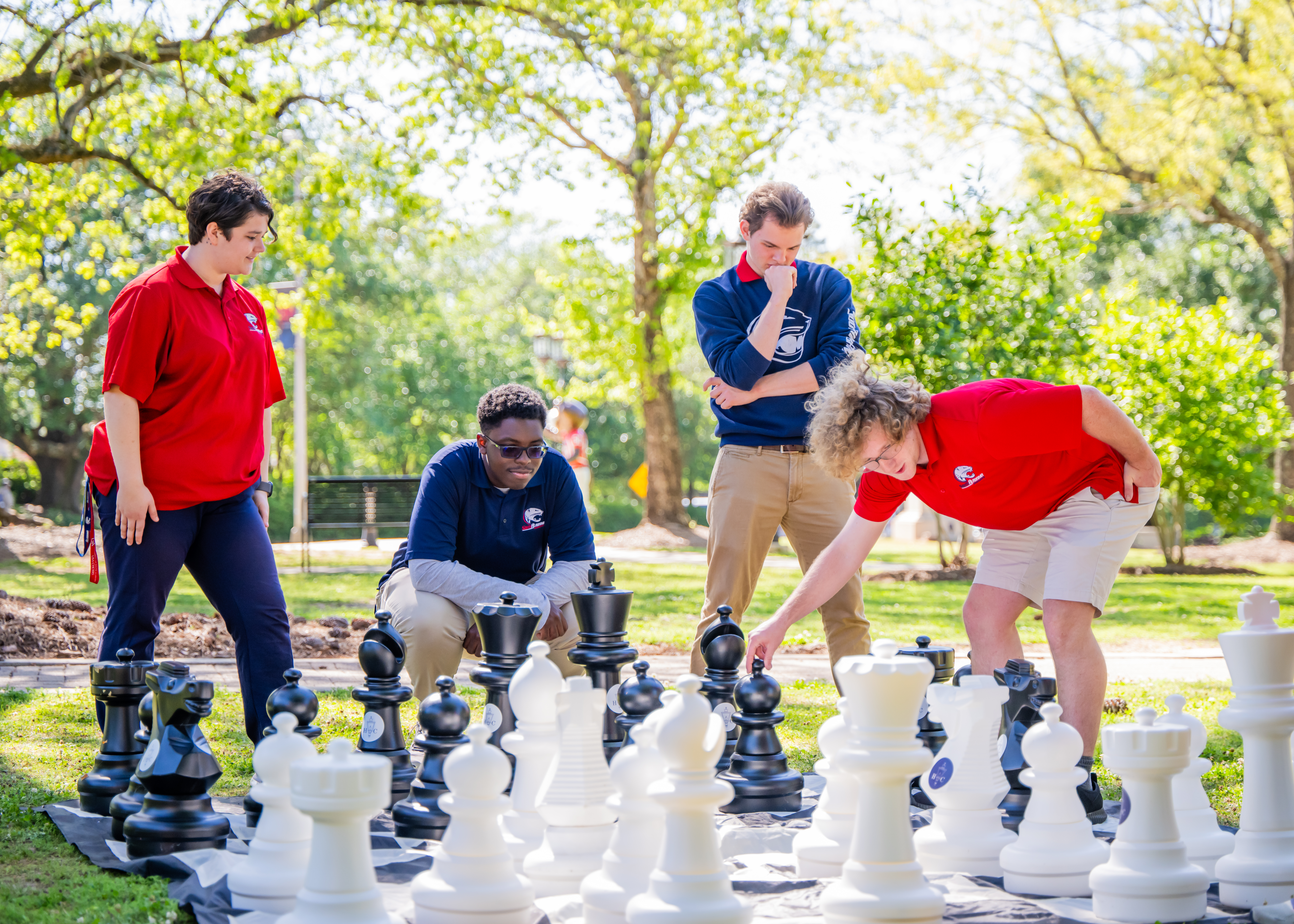Einstein statue on campus. South Alabama entrance. Student with headphones on. Honors students playing large chess set.
