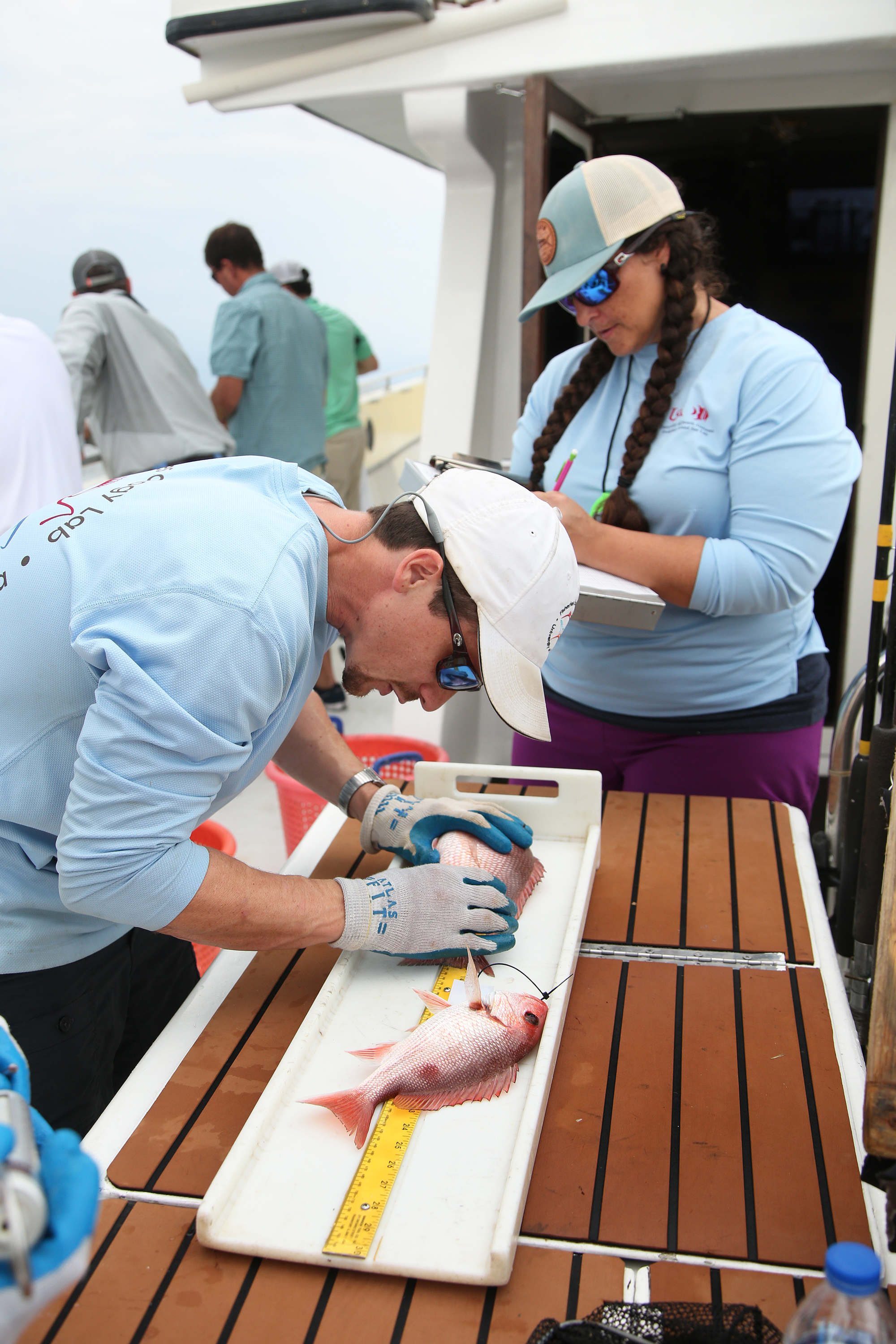 Students looking at sample in lab. Students dissecting in life sciences lab. Students working with professor on dissection in classroom. Marine Sciences student studying snapper fish on boat.