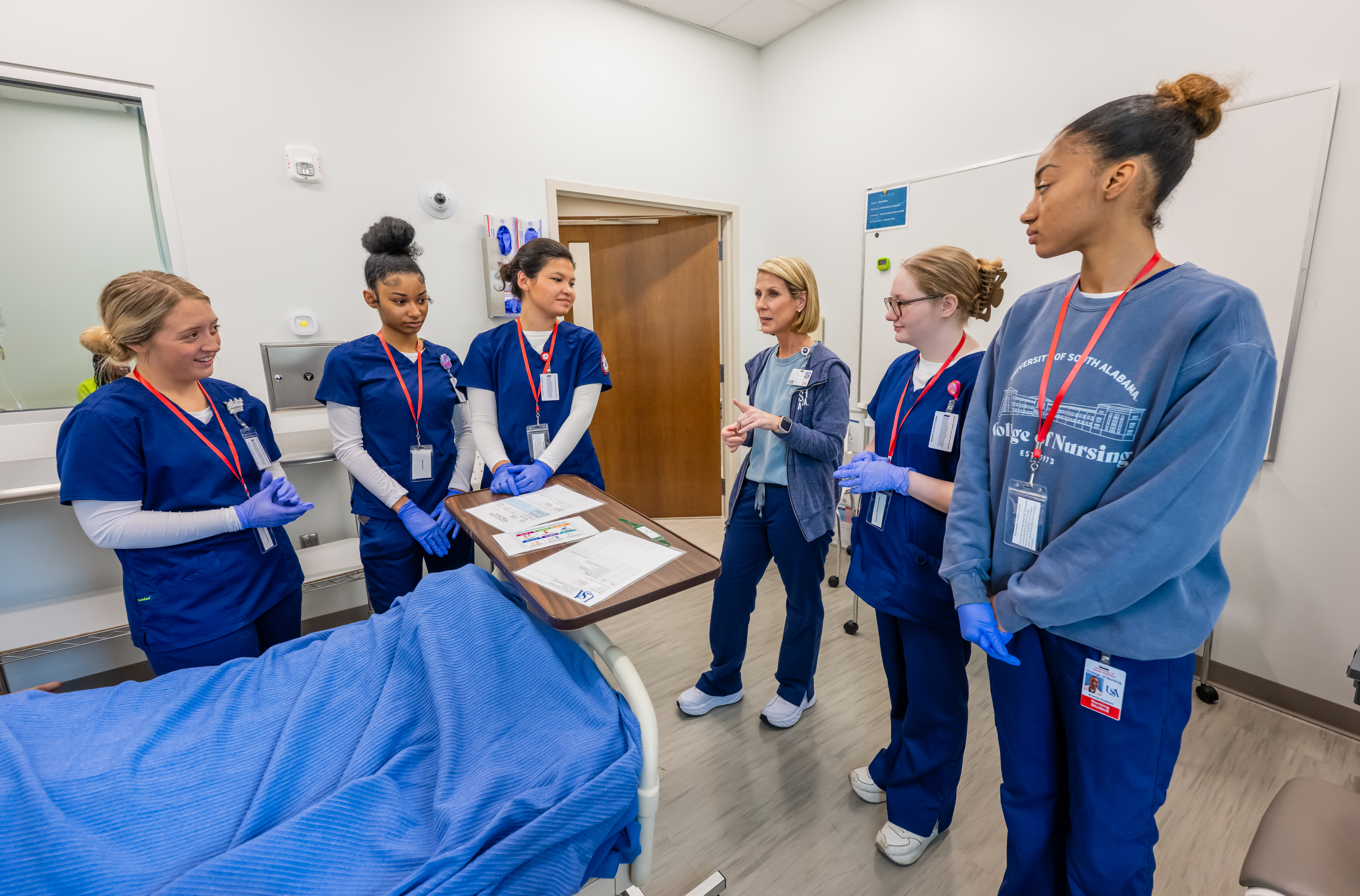 Nursing students in simulation lab. Students in PA class. Person making pottery. Students taking notes on boat in Marine Sciences.