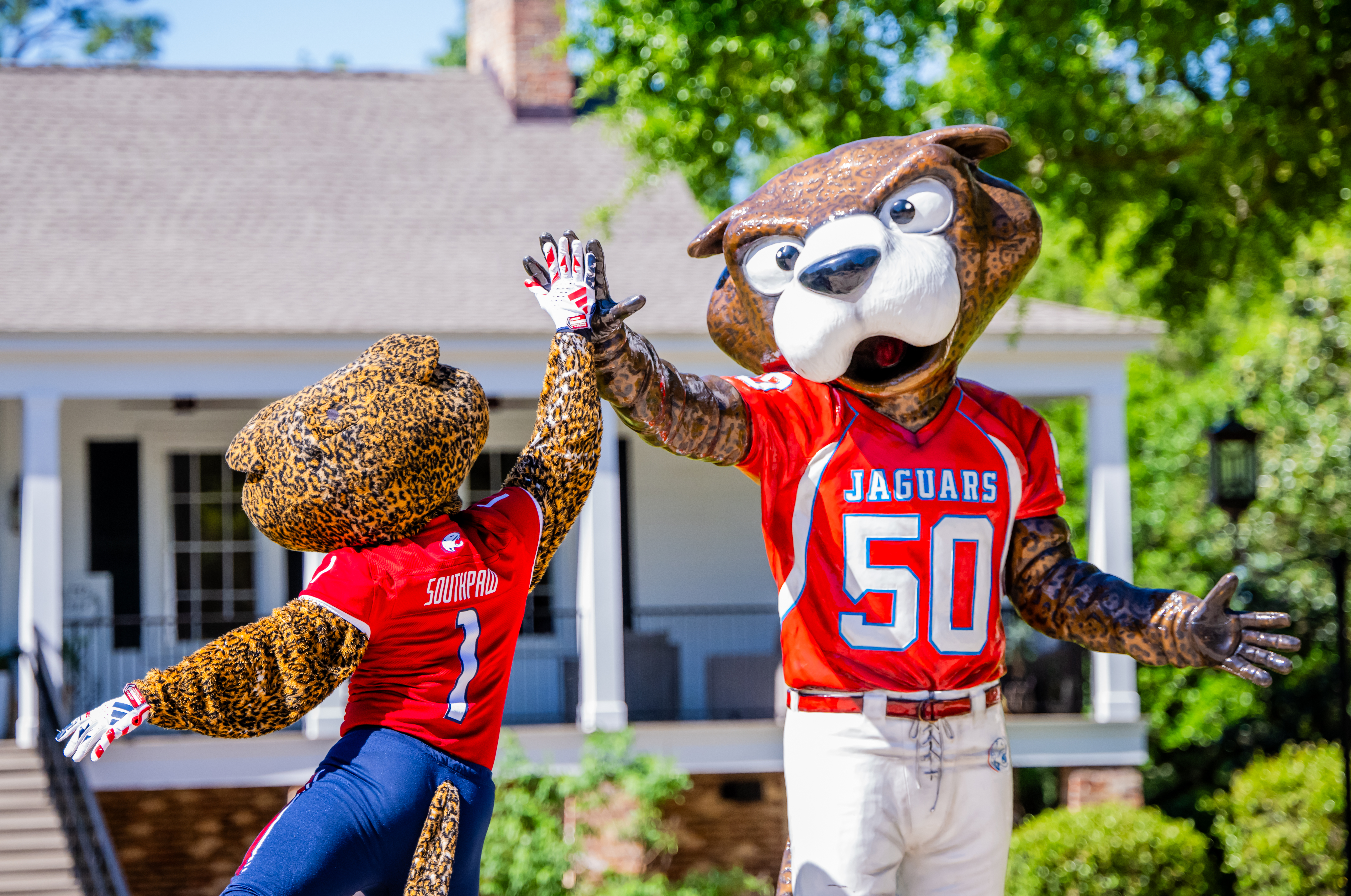 Southpaw highfiving the Southpaw statue. Stanky Field South Alabama trolley. USA boxwood sign.