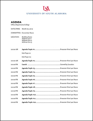 Click below to download the standard USA agenda in Word. The file is preloaded with the correct fonts. You may customize the content and layout for your specific needs, but the standard header should remain at the top of the page.