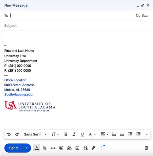 To be brand compliant, faculty and staff should use the approved signature block with either the USA logo with the flagship tag or the “Ready. South. Go.” logo. The format allows for customizing location and phone numbers but should not contain any other information or language except that which relates to funded research projects that require such promotion affixed to email signatures. Instructions on how to update your email signature to meet brand standards can be found here.