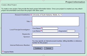 Within the Project Information screen, enter the project title and Principal Investigator (PI) first and last name. Select Continue.
