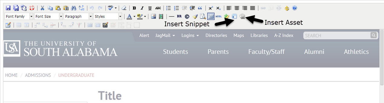 A snippet can also be inserted onto a number of pages, but it can be edited directly from your page. A snippet changed on one page does not affect the snippet when used on another page. Snippets are divided into categories according to the page type you are editing. Please see Templates (Snippets) under the Webmaster Resources for examples.