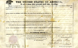 A presidential land grant from the Franklin Pierce administration, dated April 1, 1854. The grant is made out to Catherine Schriffle, the widow of George Schriffle, a veteran of the War of 1812. The land was situated in Cahaba, Alabama.