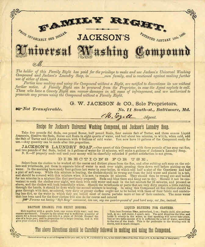 G. W. Jackson and Company's Universal Washing Compound. The Baltimore company issued these certificates as a way to cut down on the infringement of their formula, which is included on this imprint dating from 1867.